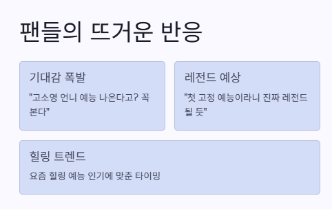 팬카페랑 커뮤 살펴보니까 다들 “고소영 언니 예능 나온다고? 꼭 본다”, “첫 고정 예능이라니 진짜 레전드 될 듯”, “고소영 오은영 스테이 기대된다” 이런 반응 엄청 많더라구.