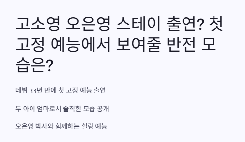 솔직히 나 처음에 기사 뜬 거 보고 눈을 의심했어. 고소영 오은영 스테이 출연이라니!! ‘헐 진짜야?’ 하고 바로 기사 찾아봤거든. 2017년 이후 방송 활동이 별로 없었는데 이번에 MBN 힐링 예능 <오은영 스테이>에 고정 출연한다고 해서 진짜 대박이라 생각했어.