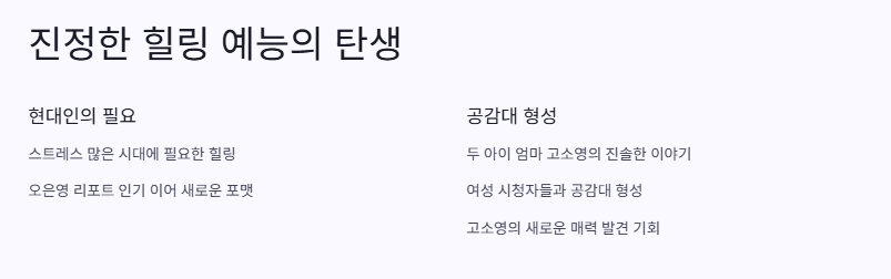 사실 나도 요즘 고민이 많아서 오은영 리포트 영상 엄청 보고 있었거든. 근데 이렇게 힐링 예능으로 고소영 오은영 스테이까지 나온다니까 나 같은 사람들한테 딱일 것 같아.