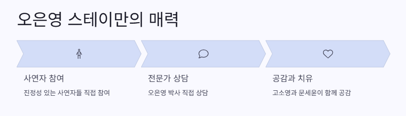 <오은영 스테이>는 단순한 상담 예능이 아니라, 사연 있는 사람들이 직접 참여하는 프로그램이라서 진정성이 느껴진대. 오은영 박사님이 직접 사연자들을 상담해주고 고소영 언니와 문세윤 오빠가 같이 공감하면서 치유의 시간을 주는 거야.