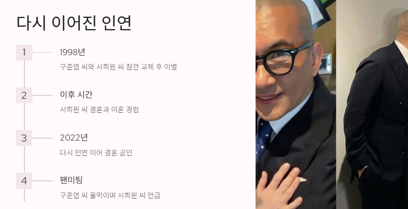 구준엽 씨와 서희원 씨는 1998년 잠깐 교제했지만 결국 헤어졌고, 이후 서희원 씨는 결혼과 이혼을 겪었어요. 그러다 2022년에 다시 인연을 이어서 결혼에 골인했는데, 그 해의 팬미팅에서 구준엽 씨가 서희원 씨 이야기를 하면서 울먹이던 모습이 아직도 기억에 남아요.
