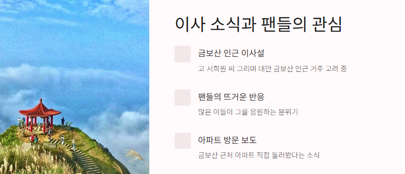 팬들 사이에서 ‘구준엽 금보산 이사설’이 뜨거운 이슈로 떠올랐어요. 많은 이들이 그를 응원하고 있는 분위기예요. - 구준엽과 서희원의 애틋한 이야기