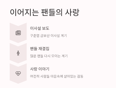 이렇게 ‘구준엽 금보산 이사설’을 계기로 다시금 많은 팬들이 모이고 있고, 그들의 사랑 이야기가 여전히 사람들 마음속에 살아 있다는 게 정말 감동이에요.