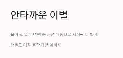 하지만 안타깝게도 올해 초 일본 여행 중 급성 폐렴으로 서희원 씨가 세상을 떠났죠. 그 소식 듣고 저도 정말 며칠 동안 마음이 안 좋았어요.