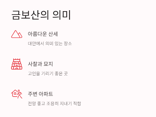 사실 저도 처음엔 ‘금보산이 어디지?’ 하고 찾아봤어요. 알고 보니 대만에서 되게 의미 있는 장소더라고요. 아름다운 산세에 사찰과 묘지가 있어서, 고인을 기리기에 딱 좋은 곳이라는 생각이 들었어요. 그리고 그 근처 아파트들은 시내에서는 조금 떨어져 있지만 전망이 좋아서 조용히 지내기에 좋다고 하더라고요.