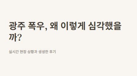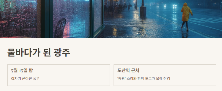 올여름 광주는 완전히 물바다가 되었어요. 7월 17일 밤, 갑자기 비가 쏟아지기 시작했는데요. 저는 도산역 근처 카페에서 친구랑 수다 떨다가 깜짝 놀랐어요. 빗줄기가 평소랑 다르게 ‘쏴아아’ 하는 게 아니라 ‘쾅쾅’ 소리까지 들렸거든요. 순간 창밖을 보는데, 진짜 영화에서나 보던 장면처럼 도로가 순식간에 물로 뒤덮이는 게 보였어요.