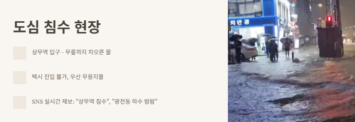 제가 친구랑 도산역에서 나와 집 쪽으로 가려고 택시를 타러 나갔는데요, 이게 웬걸! 상무역 입구 앞에 물이 무릎까지 차 있었어요. 기사님도 “여긴 못 들어가요” 하고 돌아가 버리고, 저희는 우산 들고도 옷이 다 젖었죠. SNS랑 커뮤니티에도 ‘광주 폭우 실시간’이 바로 뜨더라고요. “상무역 침수”, “광천동 하수 범람”, “광주 침수 현장” 이런 글이 수두룩했어요.