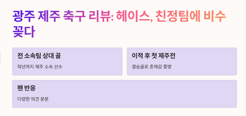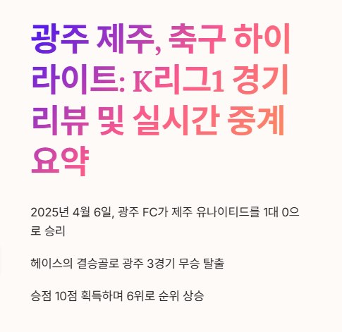 Q2. 이번 광주 제주 축구 경기의 주요 포인트는 무엇이었나요? 감독의 공백, 극적인 후반 결승골, 중원 장악과 세트피스 전략이 핵심이었습니다.