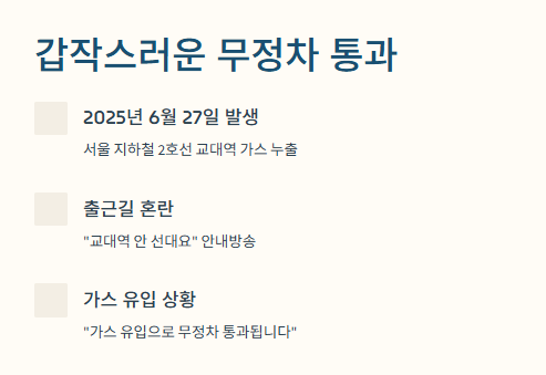 2025년 6월 27일, 서울 지하철 2호선 교대역에서 가스 누출로 인해 갑작스럽게 무정차 통과 조치가 내려졌어요. 시민들은 출근길 혼란을 겪었고, 온라인 커뮤니티는 순식간에 “교대역 무정차 통과”라는 키워드로 들끓었죠. 이 글에서는 1. 사고 경위와 원인, 2. 무정차 조치 시간 및 배경, 3. 현장 시민 반응과 교훈 등을 정리해 드릴게요.
