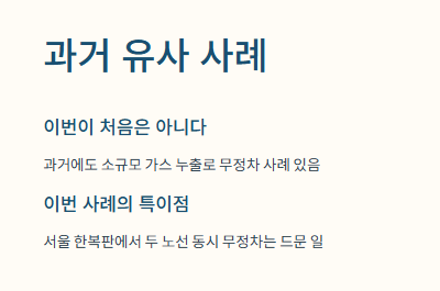 사실 나도 찾아봤는데, 예전에도 소규모 가스 누출로 무정차한 사례가 있었대. 이게 처음은 아니지만, 이번처럼 서울 한복판에서 정식으로 두 노선이 동시에 무정차한 건 꽤 드문 일이래.