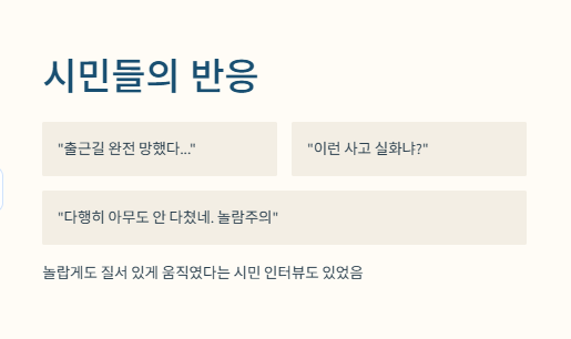등등… 다들 놀란 티가 팍팍 났지. 근데 놀랍게도 질서 있게 움직였다는 시민 인터뷰도 있었어. 이럴 때는 침착하게 대처하는 게 최고인 듯!