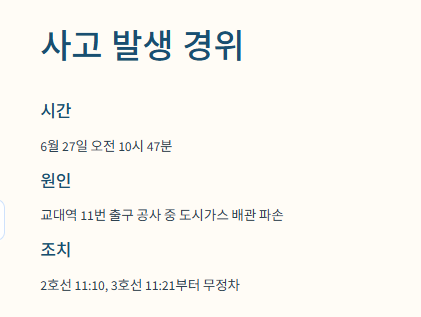 그날은 6월 27일이었고, 오전 10시 47분쯤이었대. 교대역 11번 출구 쪽에서 외부 공사 중 도시가스 배관이 파손됐고, 그 가스가 그대로 지하철역 안으로 유입됐대. 완전 대형사고 위기였던 거지. 그래서 2호선은 오전 11시 10분부터, 3호선은 11시 21분부터 무정차 통과에 들어갔고.