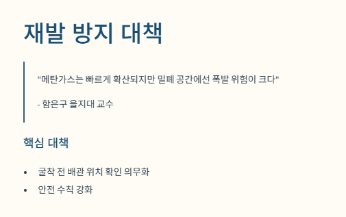 함은구 을지대 교수 말로는, “메탄가스는 빠르게 확산되지만 밀폐 공간에선 폭발 위험이 크다”고 했어. 그래서 굴착 전 배관 위치 확인이 엄청 중요하대.