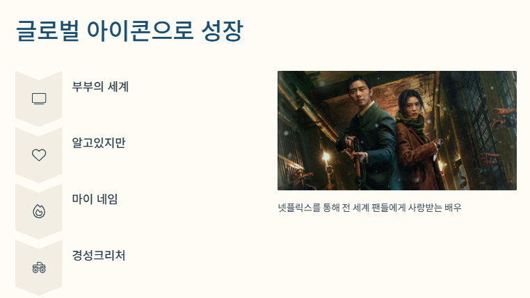 언니를 본 사람들은 다 알겠지만, ‘부부의 세계’, ‘알고있지만,’, ‘마이 네임’, 그리고 넷플릭스 ‘경성크리처 시즌2’까지 진짜 레전드 작품 줄줄이! 글로벌 팬 많아진 것도 다 이유 있는 거지.
