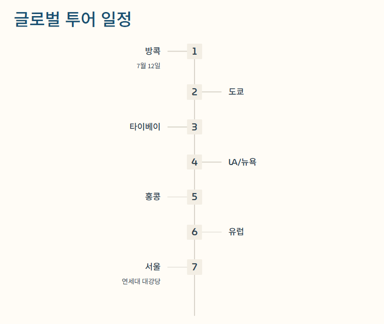 내가 갔던 방콕 공연은 7월 12일! 그 다음 도쿄, 타이베이, 로스앤젤레스, 뉴욕, 홍콩, 유럽도 가고, 마지막으로 서울 연세대 대강당에서 피날레까지! 아직 티켓 예매 안 한 사람들은 언니 공식 SNS, 팬 플랫폼 ‘하이앤드’ 자주 들어가 보길 추천해. AND MORE 써 있는 거 보니까 아직 추가 도시도 있는 듯?