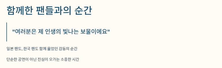 팬미팅 마지막에는 언니가 팬들을 향해 “여러분은 제 인생의 빛나는 보물이에요”라고 말했어. 솔직히 그냥 말 한마디에 심쿵했던 거 실화. 내 옆에 있던 일본 팬 언니는 울면서 고개 끄덕였고, 나도 눈물나더라.