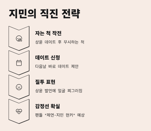 하지만 지민도 그냥 넘길 애는 아님. 제연이 상윤이랑 데이트하고 온 날 일부러 자는 척하면서 무시했지만, 다음날 바로 데이트 신청해서 감정 다시 잡으려는 모습 보여줬잖아.