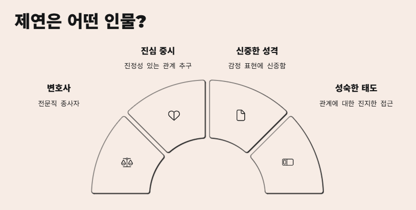 제연은 변호사로 일하고 있으며, 감정 표현은 신중하지만 진심이 담긴 관계를 중시합니다.