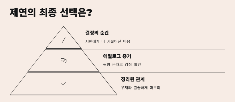 현재까지의 분위기로 보면 상윤이 초반에 밀어붙이긴 했지만, 제연의 표정이나 대화 내용을 보면 결국 지민한테 마음이 더 가 있는 거 같음. 제연은 우재랑도 정리 잘 했고, 이제 지민한테만 집중하는 느낌이 들긴 해.