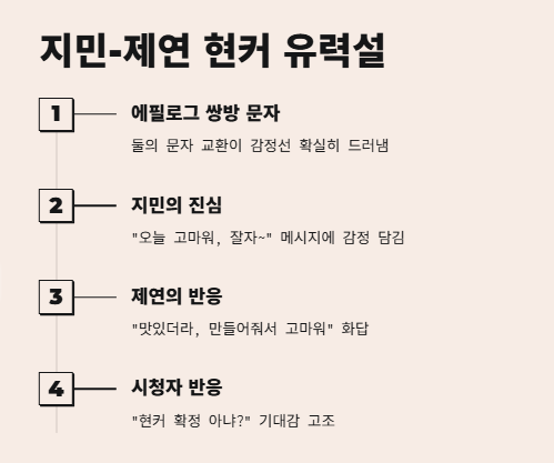 일단 지민이랑 제연이 ‘하트페어링 현커’로 강력하게 점쳐지는 이유는 바로 에필로그 때문! 둘이서 쌍방 문자 주고받는 장면이 진짜 감정선 꽉 잡았어. 지민이 “오늘 고마워, 잘자~” 하니까 제연이 디저트 얘기까지 꺼내면서 “맛있더라, 만들어줘서 고마워” 이러는데, 이건 진짜 말 다 했지.