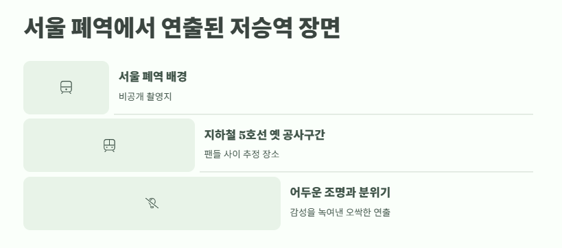 ‘저승역’ 장면은 서울의 폐역을 배경으로 촬영된 것으로 알려졌죠. 정확한 장소는 비공개지만, 팬들 사이에서는 지하철 5호선 옛 공사구간으로 추정되고 있어요. 실제로 어두운 조명과 분위기가 오싹한데, 그 안에 감성을 녹여낸 연출이 놀라웠어요.