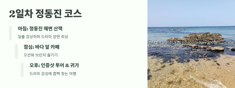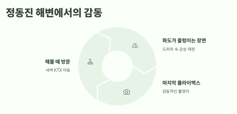 정동진 해변은 해뜰 때 방문하면 정말 감동이에요. 저는 새벽 KTX를 타고 이동했는데, 해가 떠오르면서 파도가 출렁이는 장면이 드라마 속 마지막 클라이맥스를 그대로 재현하는 느낌이었어요.