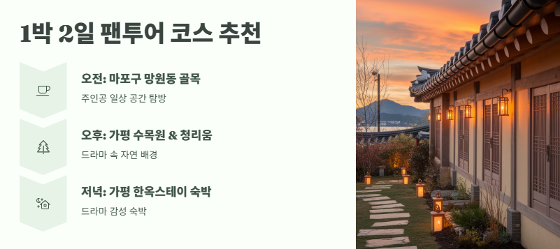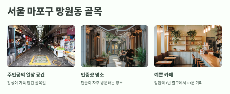 일상 장면들이 등장하는 마포구 골목길은 감성이 가득 담긴 공간이에요. 골목 곳곳에서 촬영된 흔적이 남아있고, 실제로도 인증샷 명소로 팬들이 자주 방문하더라고요. 저는 망원역 1번 출구에서 10분쯤 걸었는데, 예쁜 카페도 많아서 브런치도 해결할 수 있었어요.