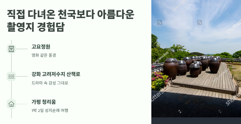지난주 주말, 드라마 팬 친구와 함께 ‘천국보다 아름다운 촬영지’를 따라 1박 2일로 성지순례 여행을 다녀왔어요. ‘고요정원’과 ‘강화 고려저수지 산책로’는 물론, ‘가평 청리움’까지 돌며 드라마 속 감성이 얼마나 현실과 닿아있는지 확인할 수 있었답니다. 특히 강화 고요정원은 정말 영화 같은 풍경이더라고요. 제가 직접 느낀 촬영지의 분위기와 팁을 함께 공유드릴게요.