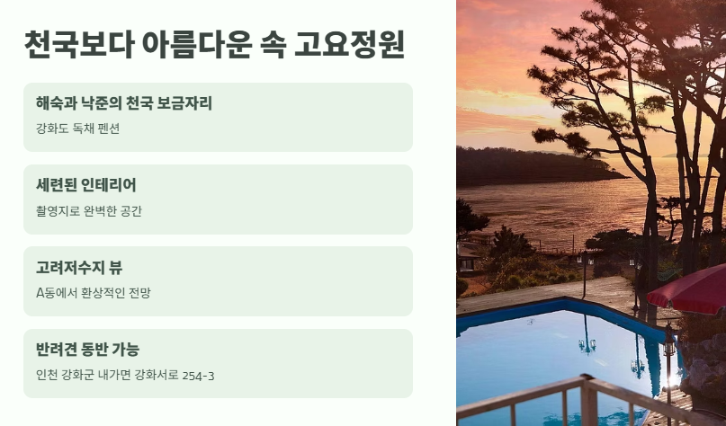 ‘해숙과 낙준의 천국 보금자리’로 등장하는 강화 고요정원은 실제로는 강화도의 독채 펜션입니다. 내부 인테리어도 너무 세련되어서 촬영지로 딱이라는 생각이 들었어요. 저는 A동에 묵었는데, 마당 너머 고려저수지 뷰가 환상적이었답니다. 반려견도 동반 가능해서 다음엔 우리 강아지랑 다시 오려고요.
