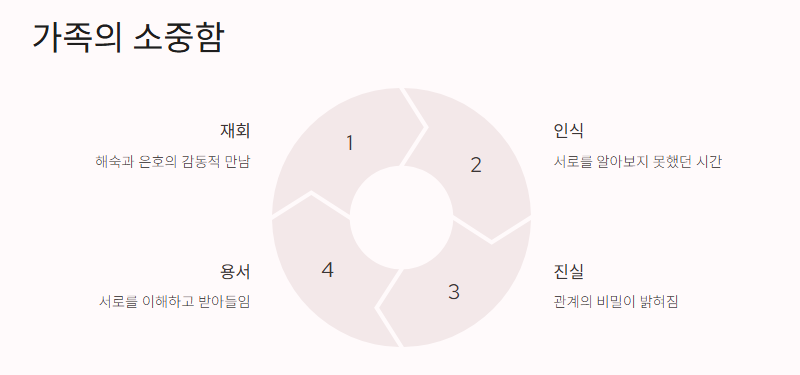 또한, 드라마 속 인물들의 관계를 보면서 가족의 소중함을 다시 한 번 깨달았어요. 특히 해숙과 은호의 재회 장면에서는 눈물이 멈추지 않았답니다. 그동안 서로를 알아보지 못했던 두 사람이 진실을 알게 되고, 서로를 용서하는 모습이 정말 감동적이었어요.
