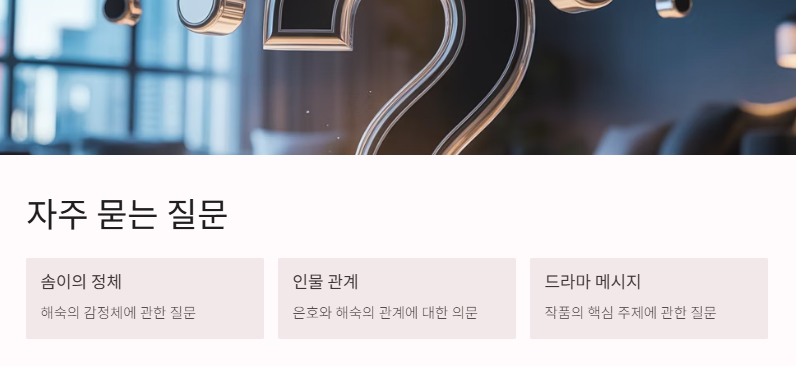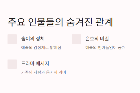 - 한지민 배우가 연기한 솜이의 정체가 이해숙의 감정체로 밝혀지며 드라마의 주요 스토리가 완성됨. 이는 가족과 용서라는 메시지를 상징적으로 전달한 요소.