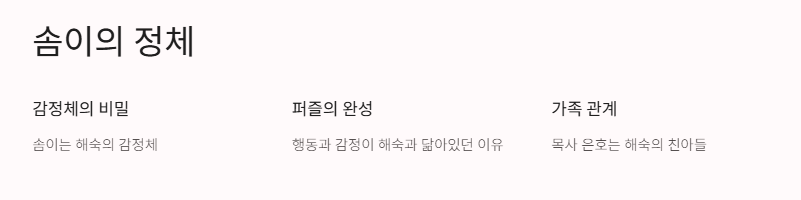 이번 회차에서는 솜이가 해숙의 감정체라는 사실이 드러났어요. 그동안 솜이의 행동과 감정이 해숙과 닮아있다고 느꼈는데, 그 이유를 알게 되니 모든 퍼즐이 맞춰지는 기분이었어요. 또한, 목사 은호가 해숙의 친아들이라는 사실도 밝혀졌죠. 이러한 전개는 가족 간의 사랑과 용서에 대해 다시 생각하게 만들었습니다.