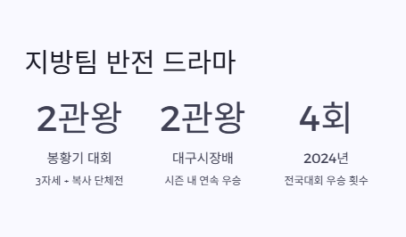 → 대구시장배와 봉황기에서 모두 2관왕, 2024년에는 전국대회 4차례 우승 경력이 있습니다.