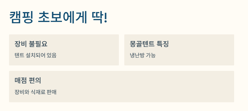 처음 방문했을 때 인상 깊었던 건 캠핑 장비 없이도 캠핑을 즐길 수 있다는 점이었어요. 대부분 텐트가 설치되어 있어서 초보자도 쉽게 캠핑 분위기를 낼 수 있죠. 몽골텐트는 냉난방까지 가능하고, 매점에서는 웬만한 장비와 식재료까지 모두 판매돼요.