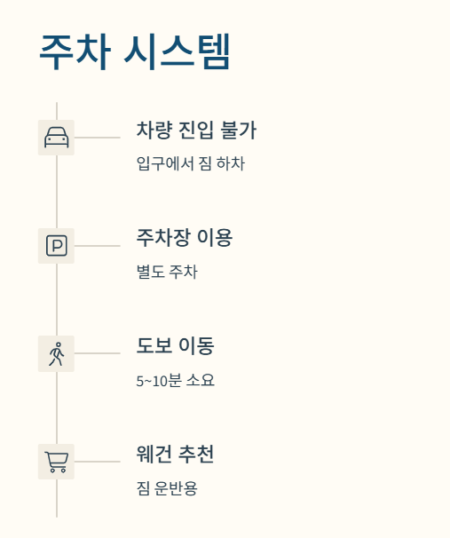 차량 진입은 안 되고, 입구에서 짐을 내려놓은 후 주차장에 주차하고 도보로 다시 캠핑장으로 이동해야 해요. 웨건을 챙겨가는 걸 강력 추천합니다. 주차장에서 캠핑장까지는 도보로 약 5~10분 정도 걸려요.