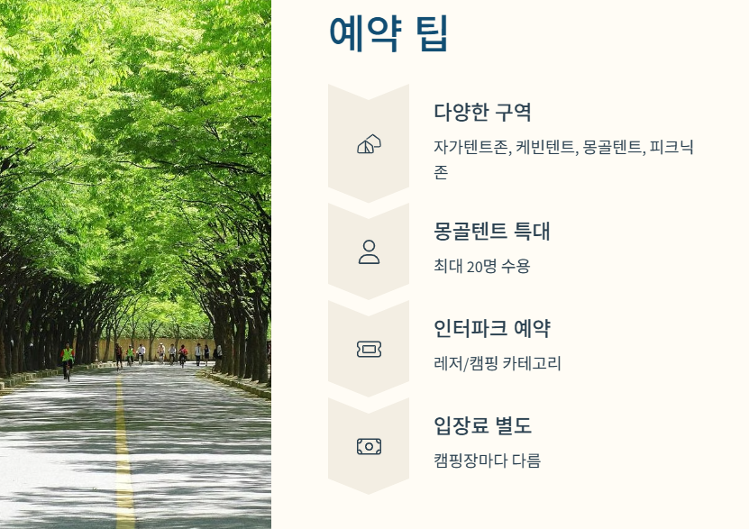 '인천대공원 캠핑장'은 예약 방식이 간편하면서도 구역 선택이 핵심이에요.