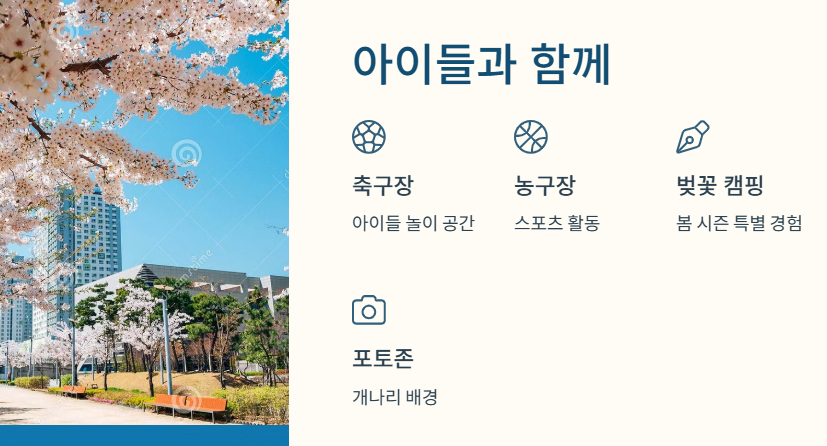 바로 옆에는 축구장, 농구장, 풋살장이 있어서 아이들과 뛰어놀기도 정말 좋아요. 봄에는 벚꽃까지 피니 ‘벚꽃 캠핑’도 가능하답니다. 제가 갔던 4월 초엔 개나리도 한창이라 사진 찍기 좋은 포토존도 많았어요.