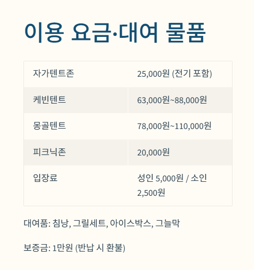 대여 가능한 물품도 다양해서 침낭, 그릴세트, 아이스박스, 이동식 그늘막 등 선택 폭이 넓어요. 대여 시 1만원 보증금이 발생하고 반납하면 돌려줍니다.