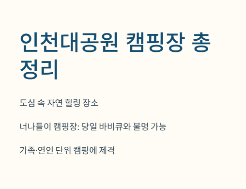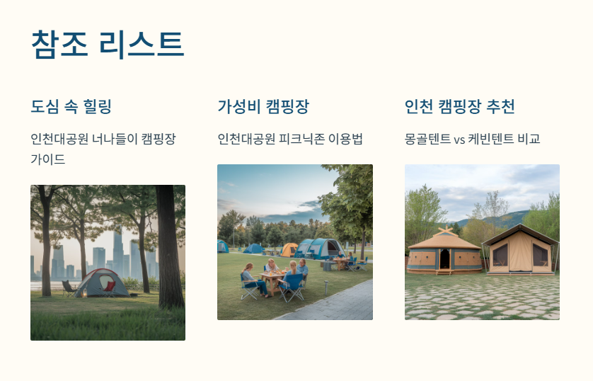 인천대공원 캠핑장은 도심 속 자연을 만끽할 수 있는 힐링 장소로, 예약 방법부터 가격, 피크닉존 운영 방식까지 꼼꼼히 살펴볼 필요가 있습니다. 특히 너나들이 캠핑장은 당일 바비큐와 불멍이 가능해 가족·연인 단위 캠핑에 제격입니다.
