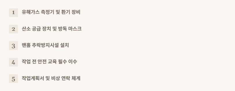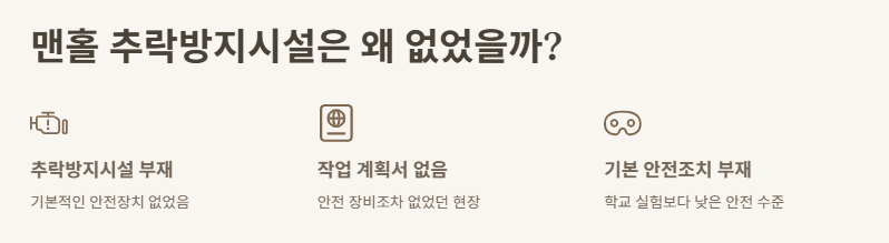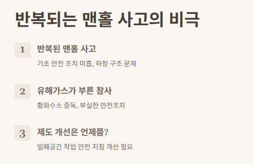 솔직히 이건 너무 기본적인 거잖아? 맨홀 추락방지시설이나 유해가스를 미리 측정하는 장비, 혹은 간단한 환풍기라도 있었다면 이 사고는 안 일어났을 수도 있어. 뉴스에서도 밝혀졌지만, 작업 계획서나 안전 장비조차도 없었다는 정황이 드러나서 더 충격이었어.