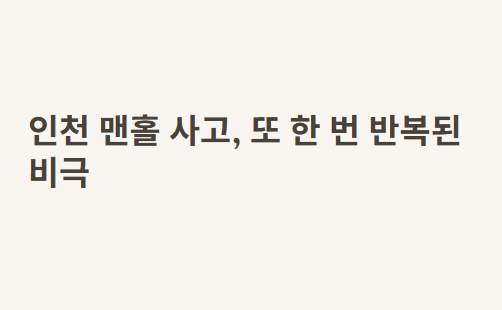 안녕. 이번에 뉴스 보고 너무 충격받아서 이렇게 글을 쓰게 됐어. 바로 인천 맨홀 사고 때문이야. 솔직히 말해서 "이런 일이 아직도 일어난다고?"라는 생각이 먼저 들었어. 몇 년 전에도 비슷한 일이 있었던 거 같은데, 또다시 사람이 죽고 다쳤다는 건 정말 심각한 문제잖아.