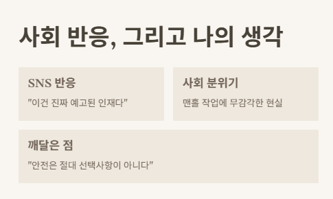 SNS에는 “이건 진짜 예고된 인재다”, “언제까지 사람 죽고 나서야 반응할 거냐”는 글이 넘쳐났어. 나도 같은 생각이야. 진짜 맨홀뚜껑이나 밀폐공간 작업에 대해 이렇게 무감각한 사회 분위기 자체가 너무 무섭더라.