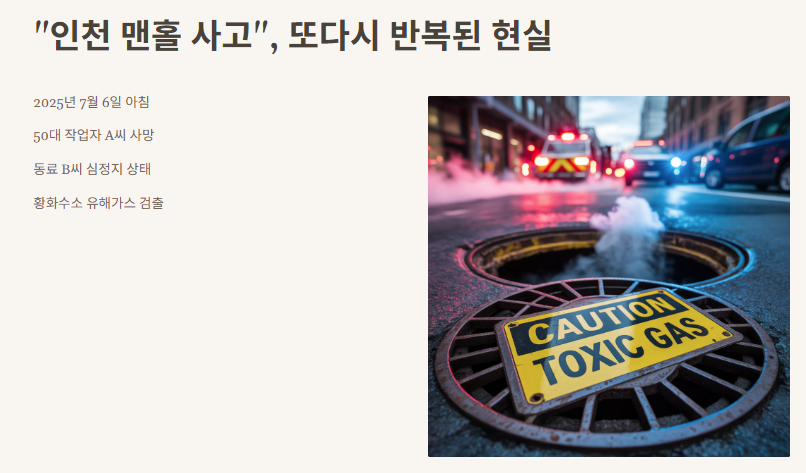 2025년 7월 6일, 인천 계양구 병방동에서 발생한 맨홀 사고는 단순한 작업 실수가 아니라 명백한 시스템의 실패로 보입니다. 이번 사고는 유독가스 노출로 인한 작업자 사망과 심정지라는 참혹한 결과를 낳았으며, 반복되는 밀폐공간 사고에 대한 근본적인 대책 마련의 중요성을 다시 한번 일깨웠습니다.