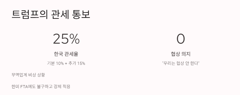 이번에 나온 관세 서한 내용 보면 진짜 강력해요. 트럼프 전 대통령이 말하길, "우리는 협상 안 한다, 미국 조건 따르지 않으면 25%든 35%든 부과하겠다" 이랬다잖아요. 심지어 한국도 기본 10% + 추가 15% = 총 25% 관세 대상이에요.