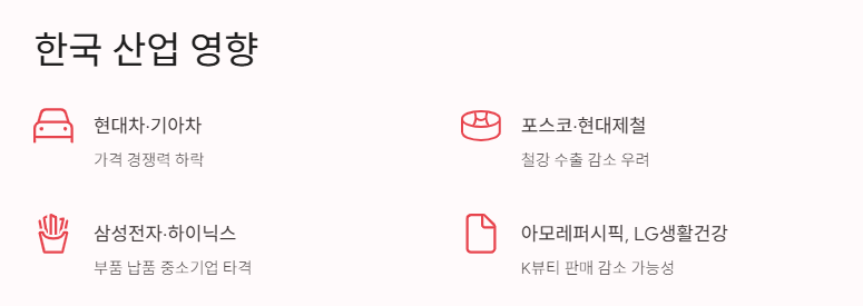 - 포스코·현대제철: 철강 제품은 이미 기존에도 관세 있었는데 더 올라가면 아예 수출 줄어들 수도 있대요.