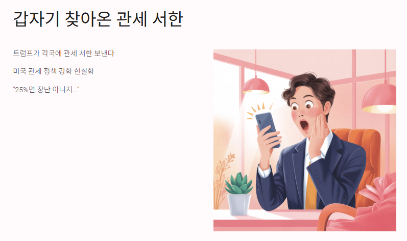 여러분 진짜 깜짝 놀랐어요. 아침에 뉴스 보는데 트럼프가 각국에 관세 서한 보낸다는 거예요. 뭐지? 미국 관세 또 시작이야? 싶었죠. 예전에도 관세청 뉴스에서 미국 관세 정책 강화된다고 한 적 있었는데, 이번엔 그게 진짜로 행동으로 옮겨진 느낌이에요.
