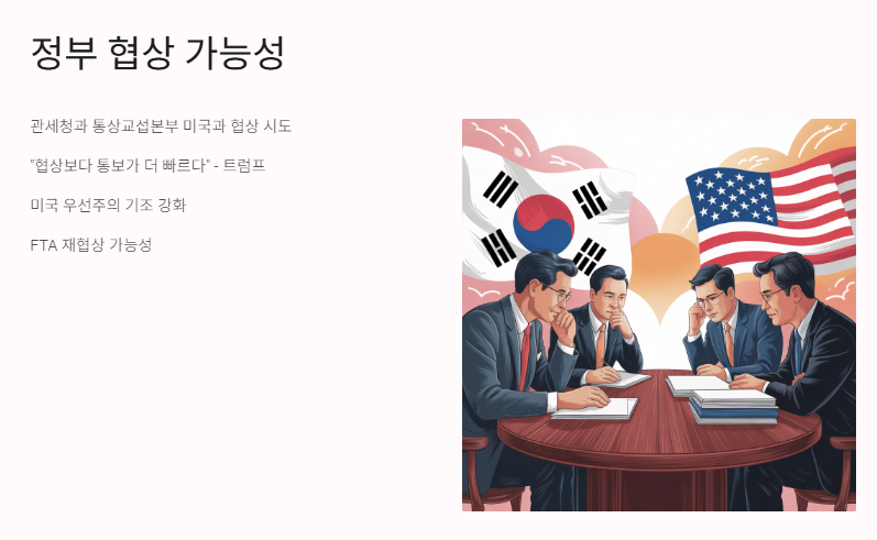 한미 FTA가 있음에도 불구하고, 한국은 25%의 관세 대상국으로 지정됐다고 해요. - 정부와 기업의 대응 전략