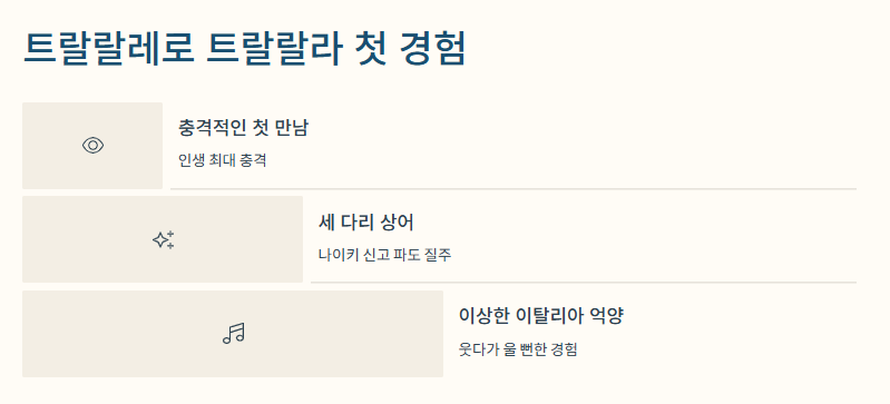 - 트랄랄레로 트랄랄라를 처음 봤을 때 충격과 웃음을 동시에 느꼈던 경험.