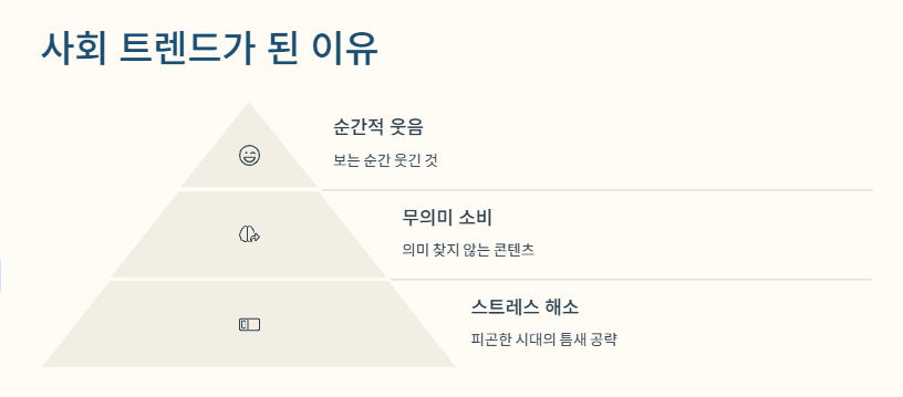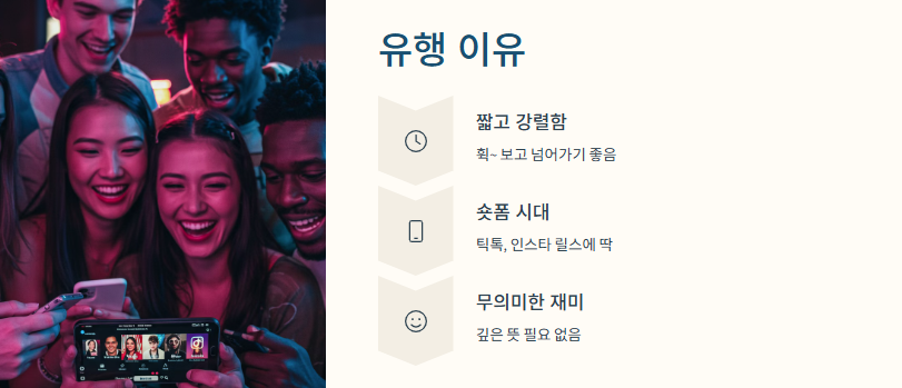 - 무의미 콘텐츠 소비 시대와 숏폼 트렌드에 딱 맞아떨어진 특성.