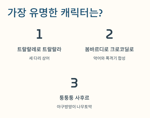 "트랄랄레로 트랄랄라" 상어 캐릭터가 제일 유명하고, 이후 "봄바르디로 크로코딜로", "퉁퉁퉁 사후르" 등이 나왔어요.